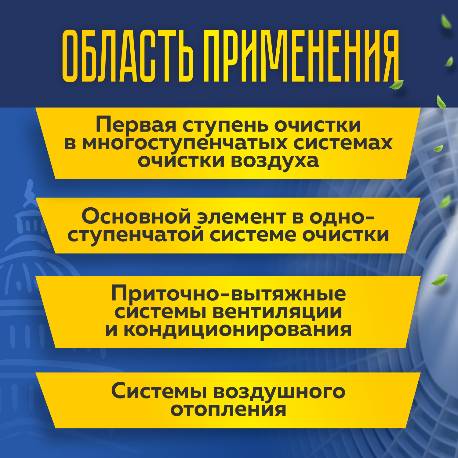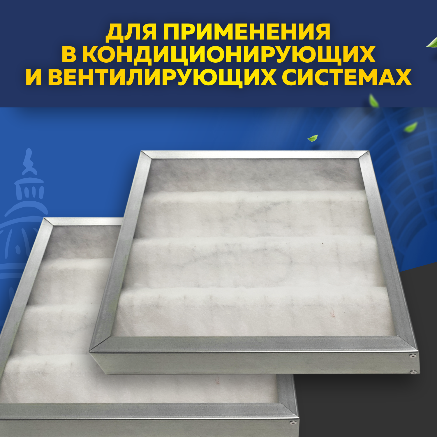 - для сухой очистки внешнего и рециркуляционного воздуха в системах вентиляции и кондиционирования во всех зданиях и сооружениях;