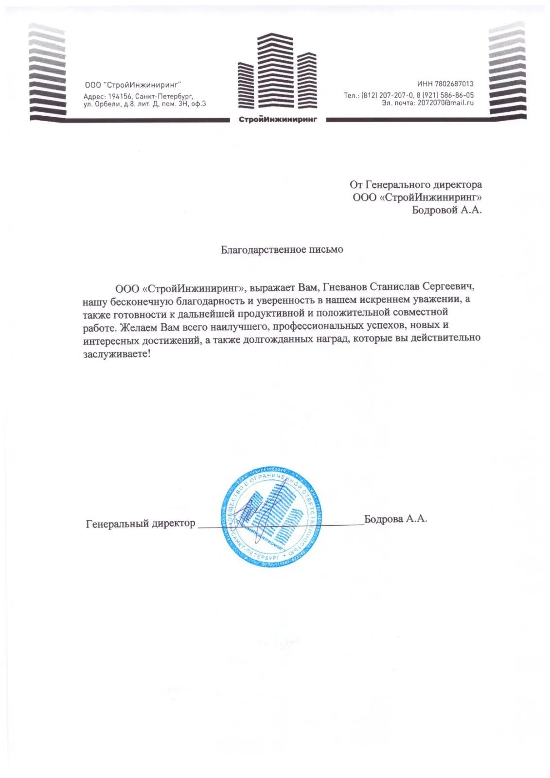 ООО "СтройИнжиниринг", выражаем Вам, Гневанов Станислав Сергеевич, нашу бесконечную благодарность и уверенность в вашем искреннем уважении, а так же готовности к дальнейшей продуктивной и положительной совместной работе. Желаем Вам всего наилучшего, ...