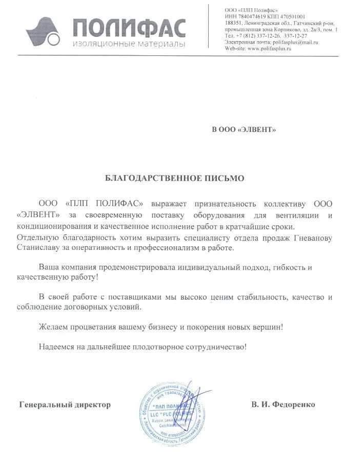 ООО "ПЛП ПОЛИФАС" выражает признательность коллективу ООО "ЭЛВЕНТ" за своевременную поставку оборудования для вентиляции и кондиционирования и качественное исполнение работ в кратчайшие сроки.