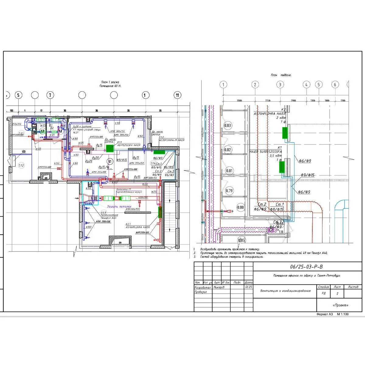 Предусмотрены системы приточной вентиляции в канальном исполнении П1 и вытяжной вентиляцией В1, В2. Воздух раздаётся сверху-вниз.
